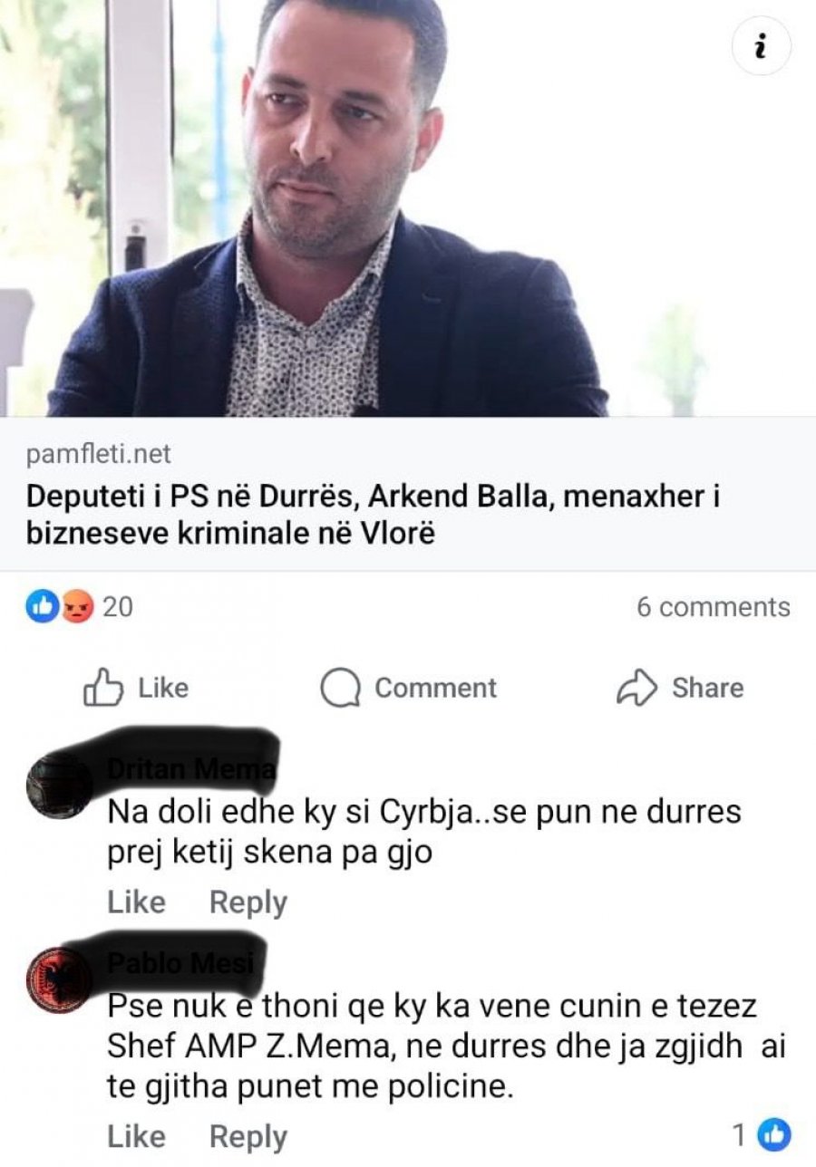 Në postimin e lajmit për lidhjet e Arkend Ballës me Troplinët, një komentues, i cili duket i informuar rreth këtij personazhi shkruan se, “Pse nuk e thoni qe ky ka vene cunin e tezes Shef AMP Z.Mema, ne durres dhe ja zgjidh ai te gjitha punet me policine.”.