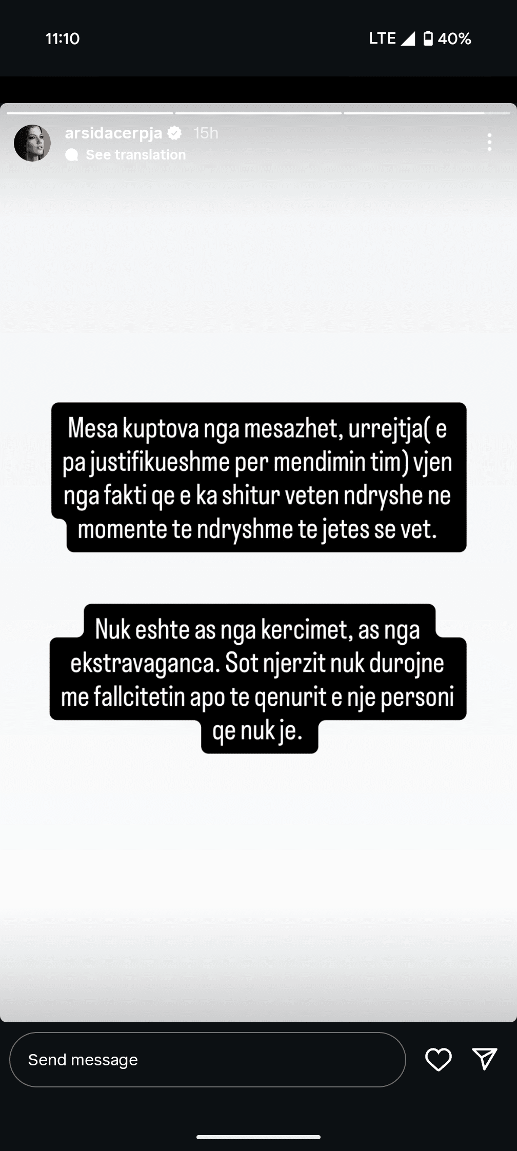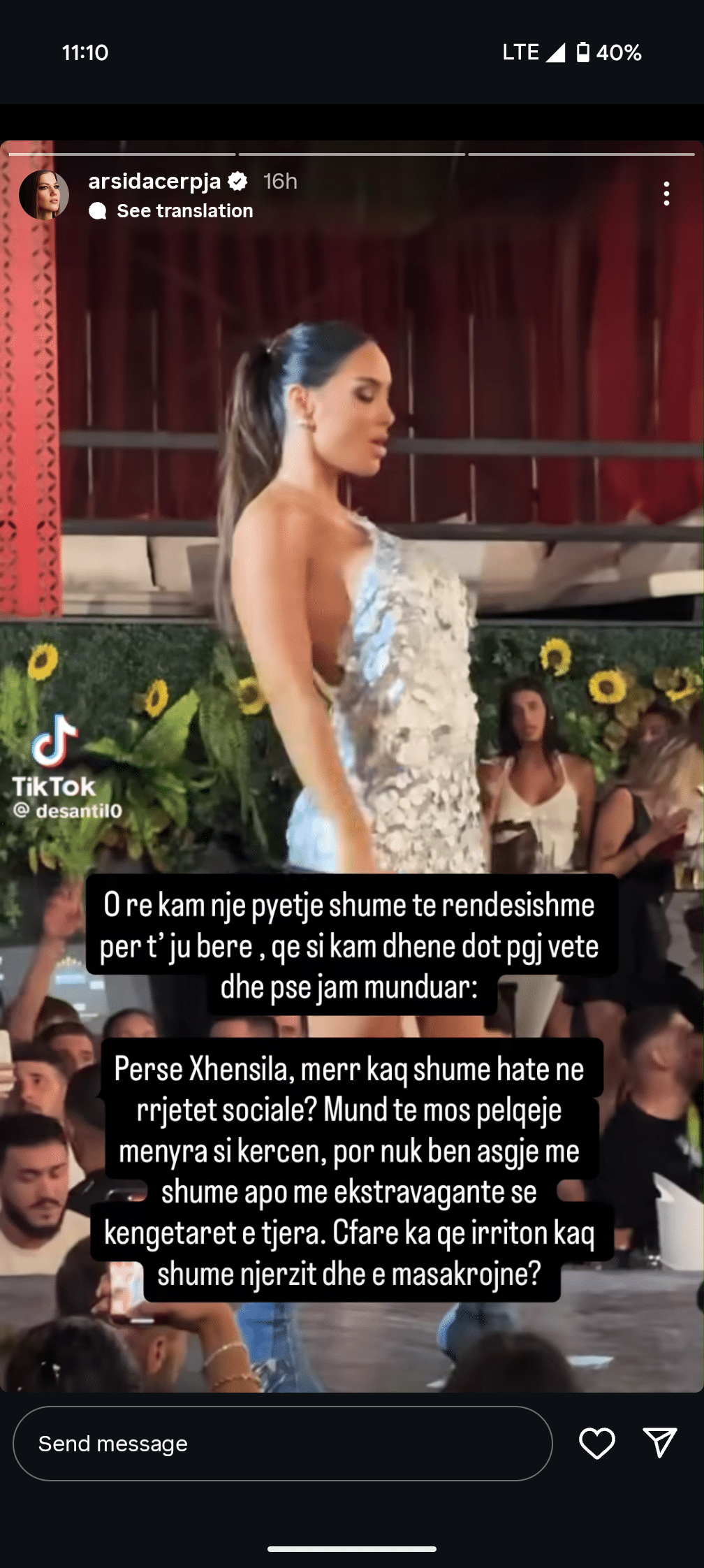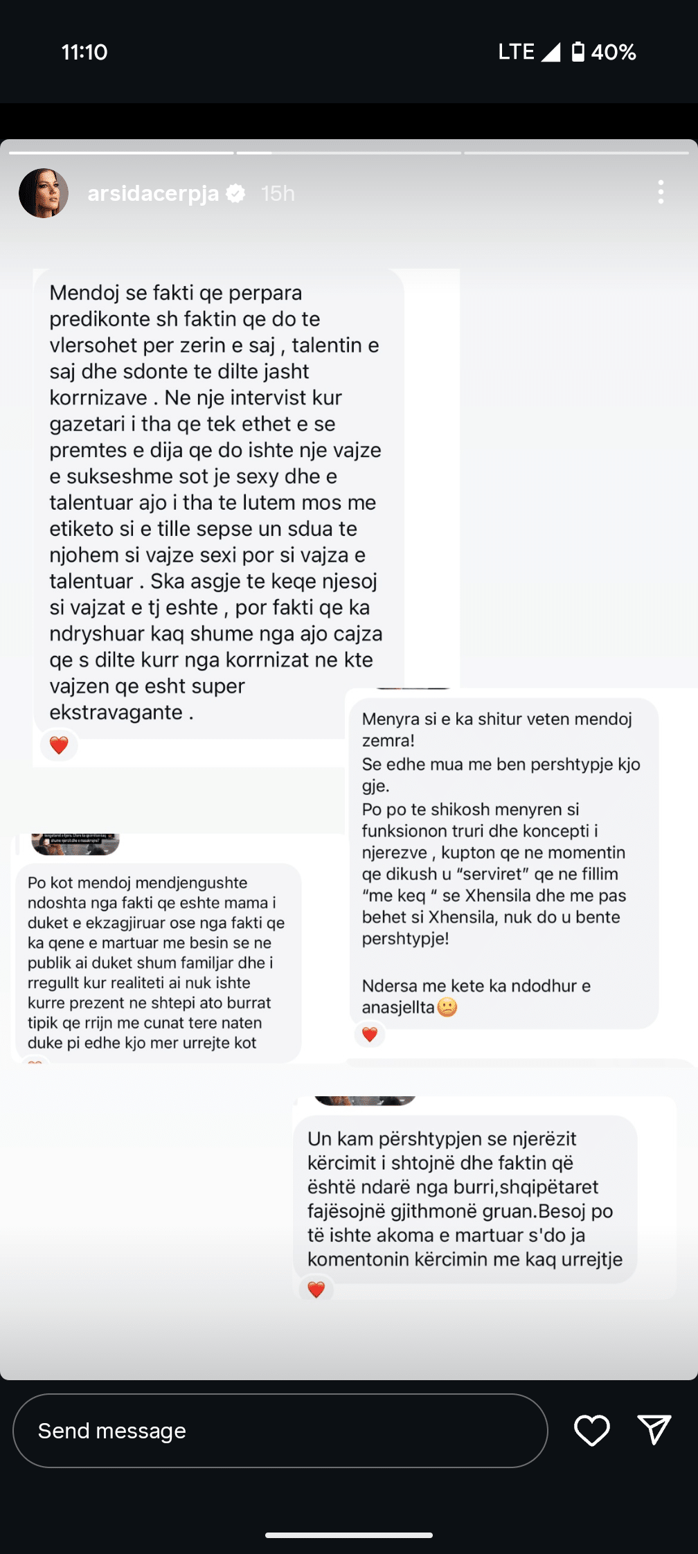 Në një postim në Instagram, ajo shprehu habinë për shkallën e kritikave që Xhensila përballet, duke vënë në dukje se nuk bën asgjë më të tepruar se artiste të tjera.