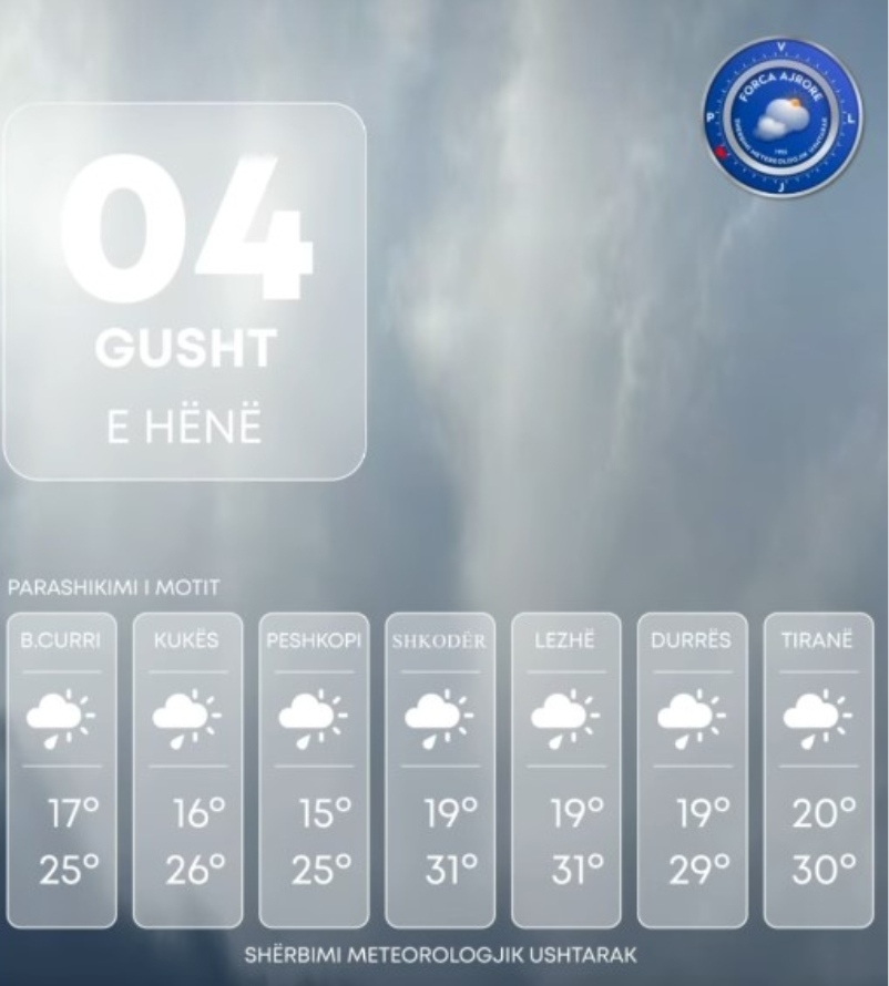 Shqipëria do të përballet me kushte të paqëndrueshme moti të hënën, më 4 gusht, ku parashikohen reshje shiu dhe stuhi të izoluar, kryesisht në veri të vendit. Ky ndryshim i motit vjen sipas parashikimeve të Shërbimit Meteorologjik Ushtarak.