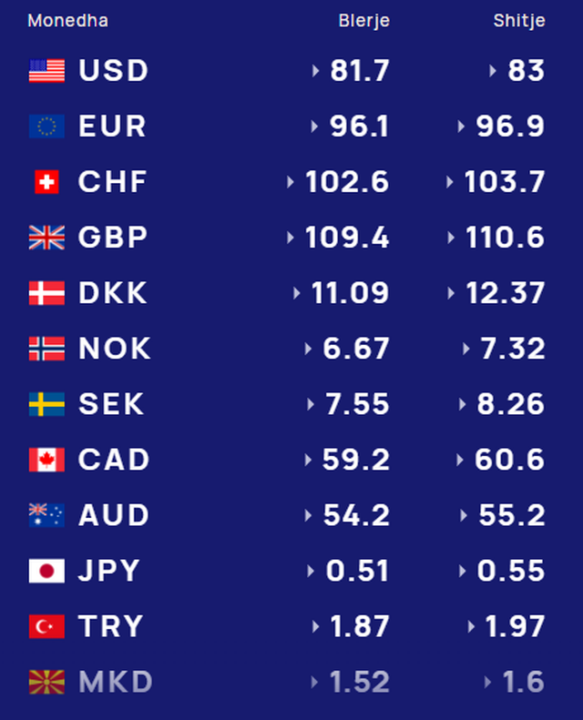 Për kursin e monedhave të tjera shihni tabelën e mëposhtme: