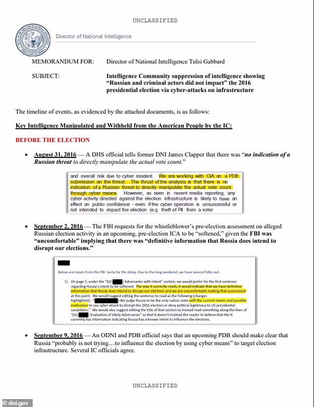 Despite earlier memos downplaying Russia’s capability, the January 2017 Intelligence Community Assessment claimed Vladimir Putin had ordered an influence campaign aimed at boosting Trump.