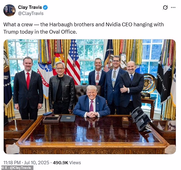The 62-year-old coach and his brother Jim Harbaugh, 61, who recently took over as head coach of the Los Angeles Chargers, had sparked headlines last week when they were spotted leaving the White House. Soon after, OutKick’s Clay Travis posted a photo of the brothers standing in the Oval Office alongside President Trump, NVIDIA CEO Jensen Huang, U.S. Trade Representative Jamieson Greer, and Commerce Secretary Howard Lutnick.