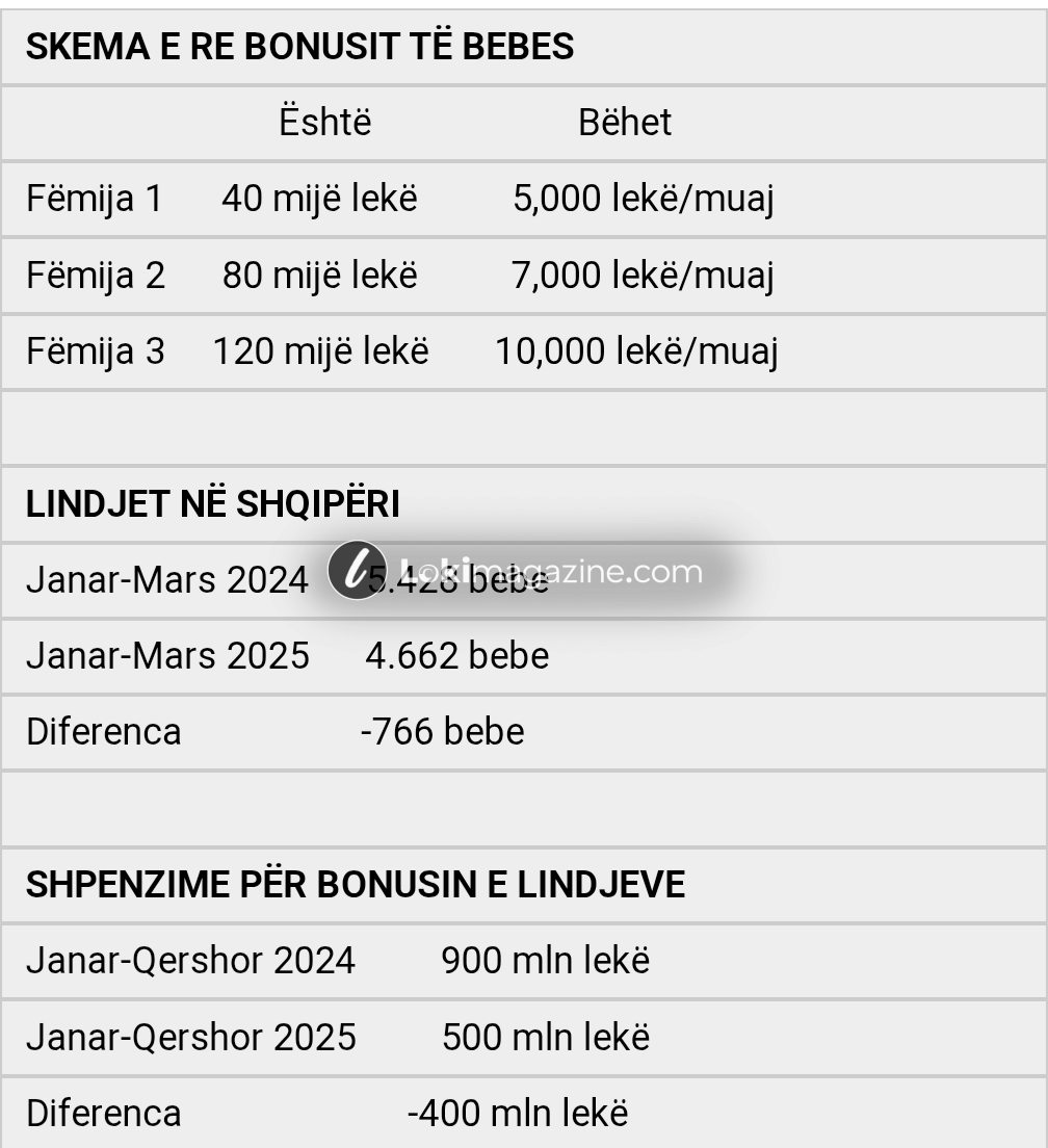 Qeveria shqiptare ka njoftuar një ndryshim thelbësor në politikën e saj të mbështetjes për lindjet. Nga 1 janari 2026, do të hiqet dorë nga çeku i njëhershëm i lindjes që jepet aktualisht në maternitet dhe do të zëvendësohet me një pagesë mujore për çdo fëmijë të porsalindur, e cila do të zgjasë deri në moshën 5-vjeçare.