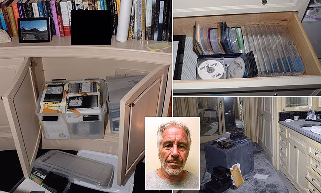 The photos—obtained exclusively by DailyMail.com—show shelves stacked with CDs, binders, and multiple hard drives, all collected during a 2018 FBI raid of Epstein’s $51 million Upper East Side townhouse. The sheer volume of digital and physical media has cast serious doubt on the Trump-era Department of Justice’s assertion that no blackmail materials were ever found.